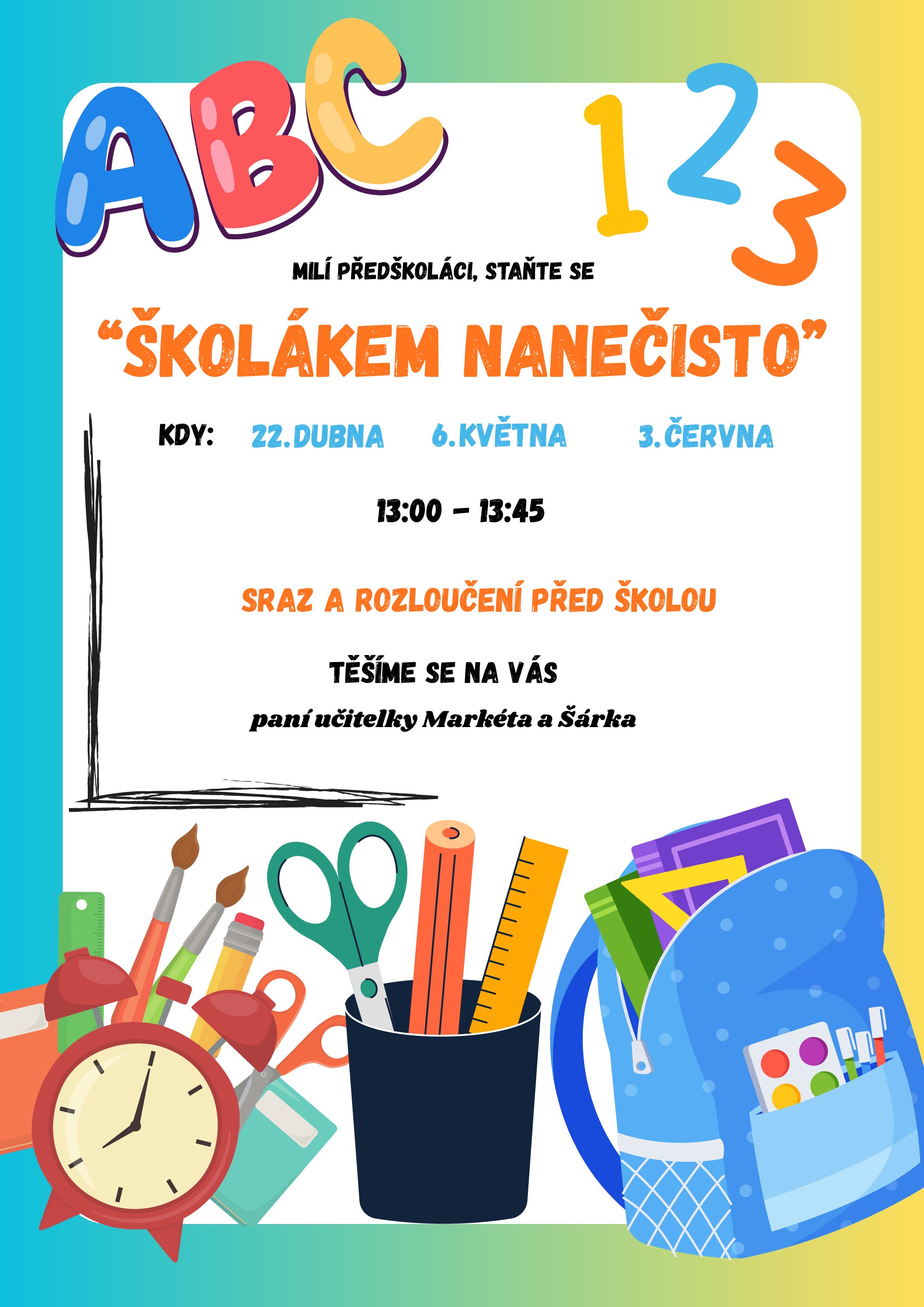 Zveme všechny předškoláky do školy, kde se setkají se svými spolužáky a poznají školu. Těšíme se na Vás!